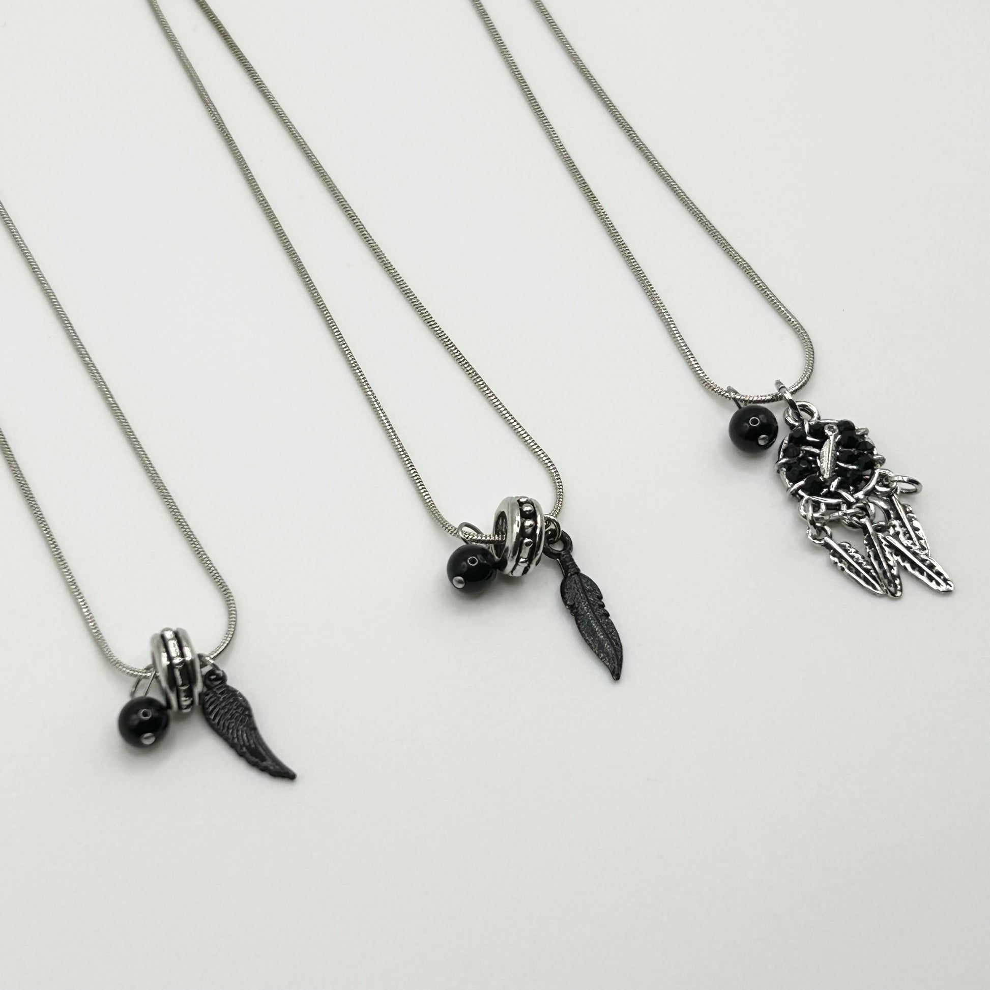 This distinctive necklace features a black feather charm, a polished black bead, and a silver cuff accent, all strung on a sleek silver-tone chain.